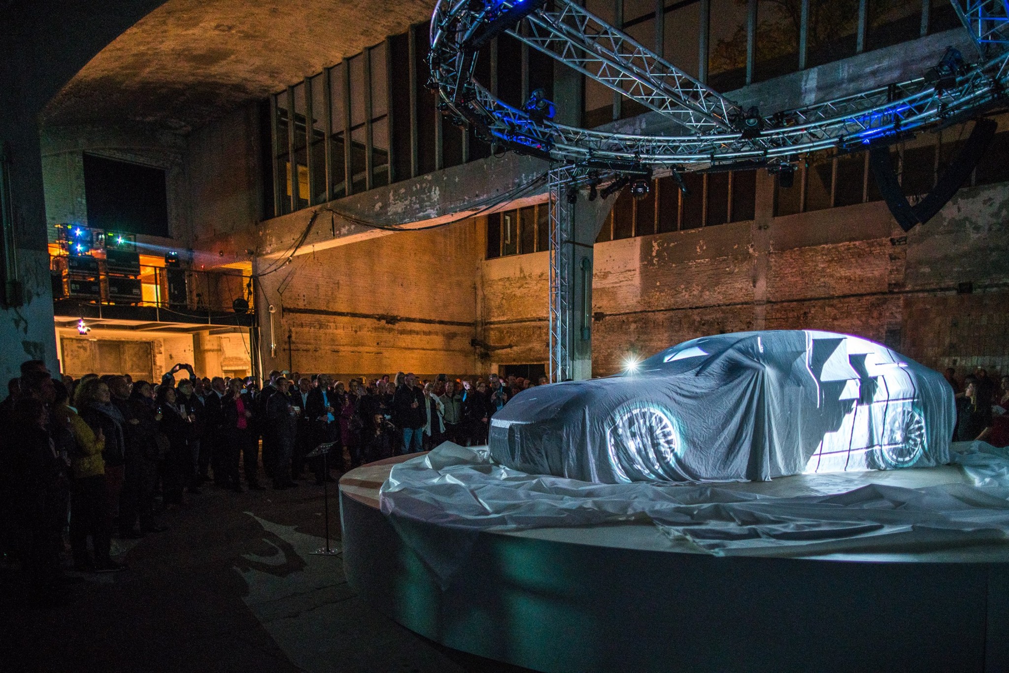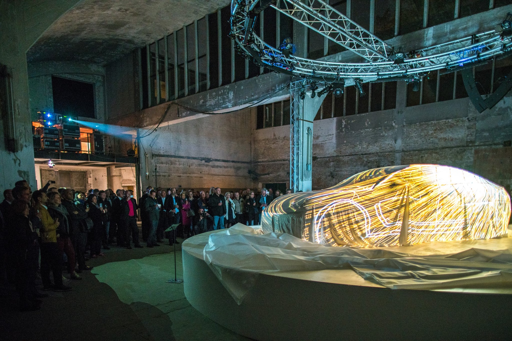 So geht Spannung: Ein runder Vorhang umhüllt den Porsche, darauf wird ein Trailer projiziert. Dann plötzlich fällt der Vorhang. Zum Vorschein kommt der Porsche – doch noch immer verhüllt. Er ist mit Stoff bezogen und seine Konturen sind nur zu erahnen. Darauf wird ein unterhaltsames 3D-Mapping illuminiert. Und dann, endlich: Der Stoff muss weichen – und der neue Porsche ist da.