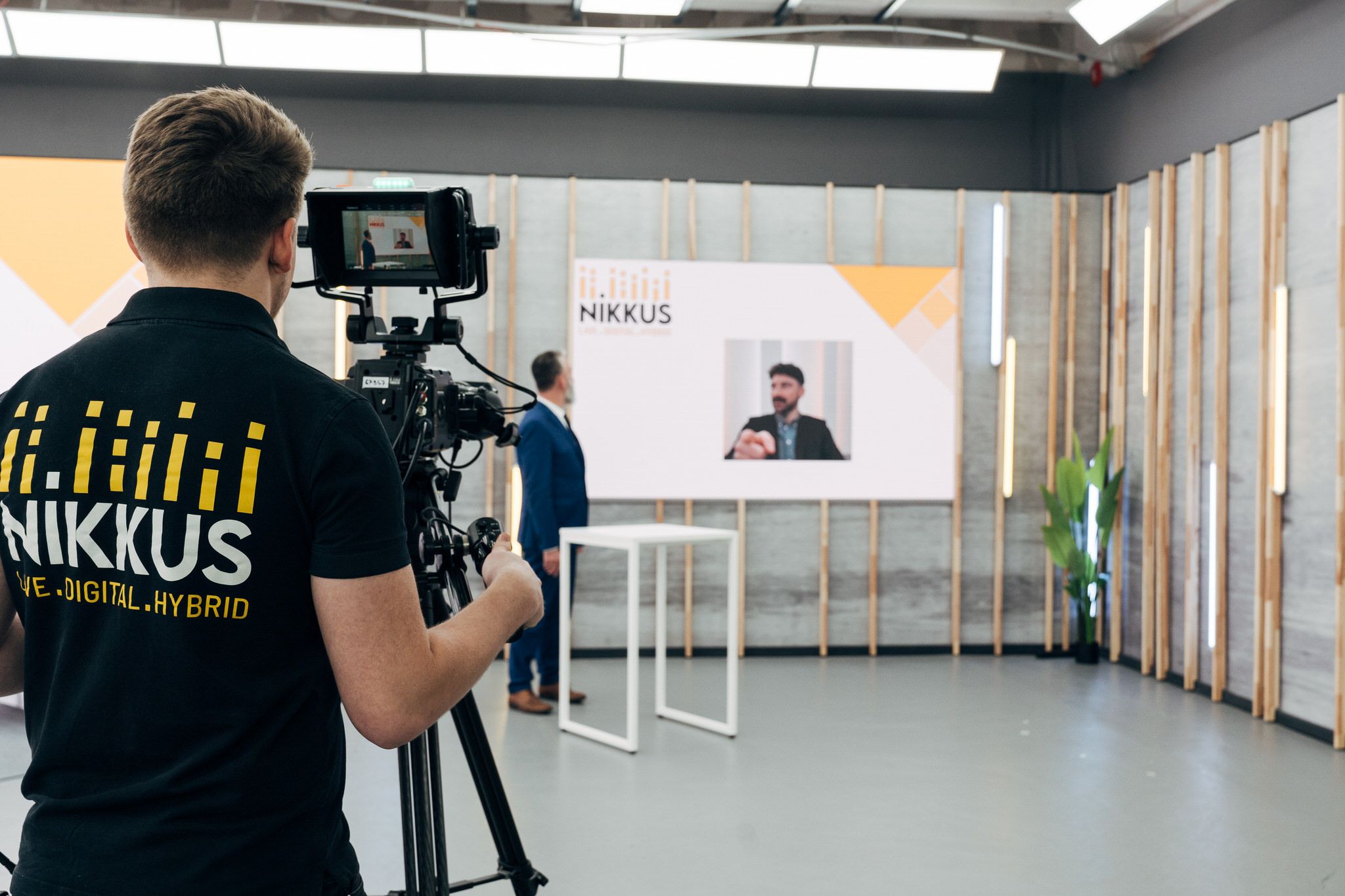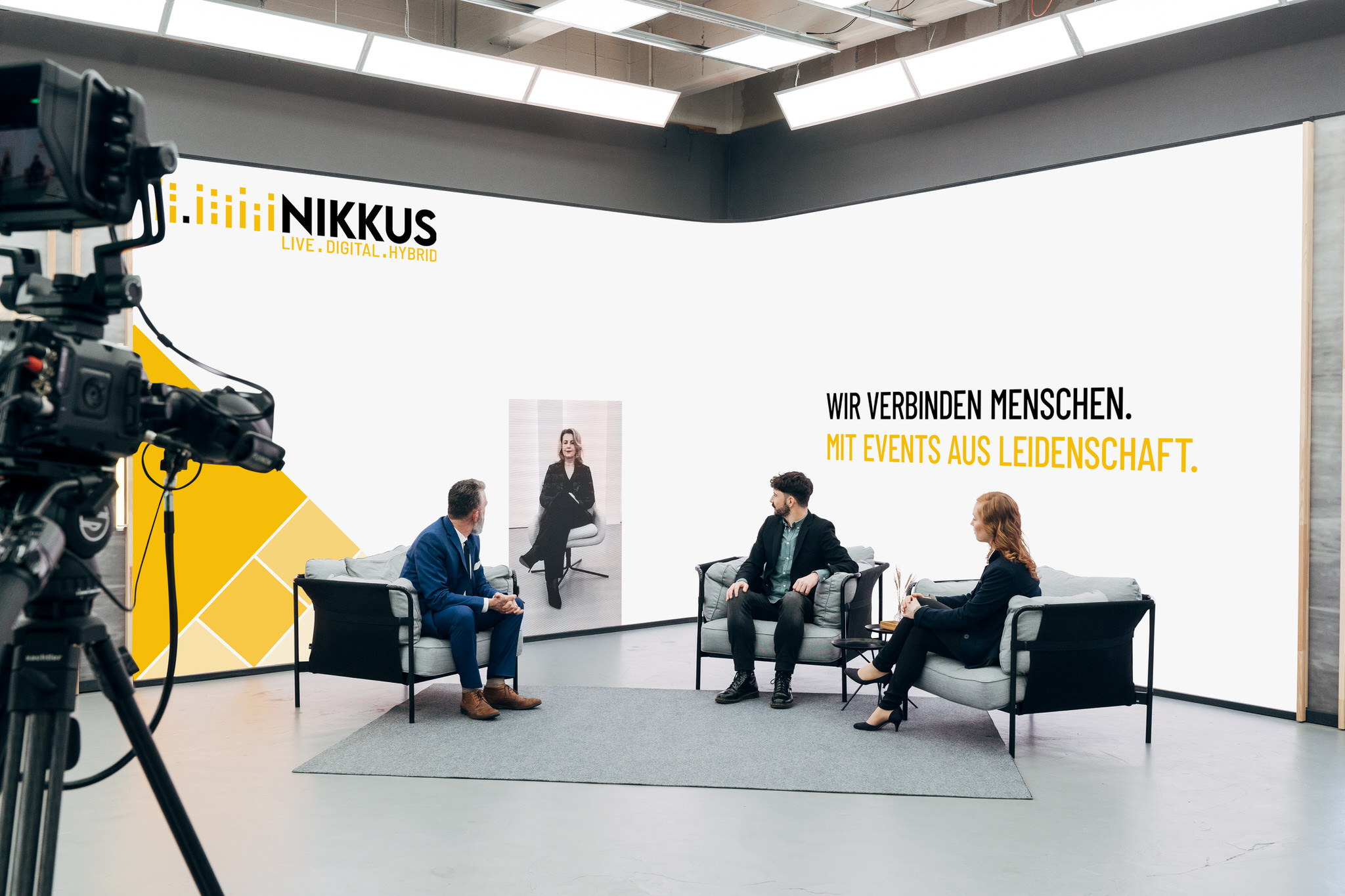 Unser LED-Studio – Szenenfläche links bietet eine Szenenfläche von 7,5 x 3,5 m mit LED-Band und einem LED Screen von 3,5 x 1,0 m. Ausgestattet mit Dekorationselementen und Möbeln sowie Ambient- und Studiobeleuchtung, eignet sich dieser Bereich perfekt für Anmoderationen, Moderationen, Talks im Corporate Design und Keynotes mit Real- und Remote-Gästen. Lassen Sie Ihre Veranstaltung in einem stilvollen Rahmen erstrahlen und begeistern Sie Ihr Publikum.